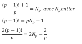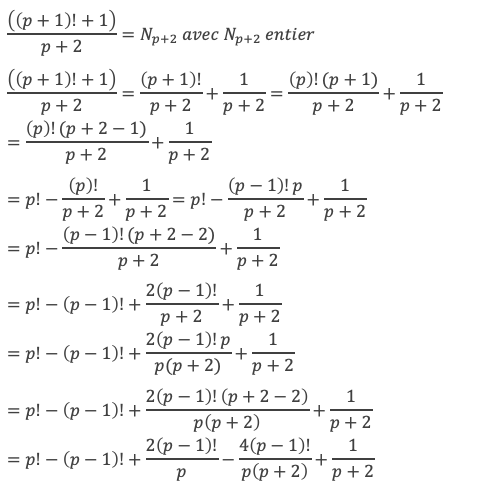 Et comme p! – (p – 1)! + 2 Np – Np+2 est un entier, cela implique que 4(p – 1)! + p + 4 est divisible par p(p + 2).