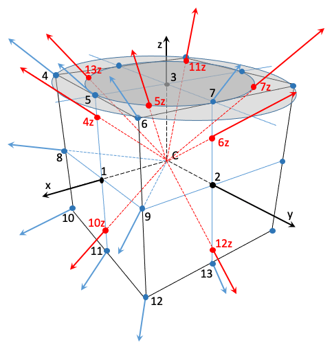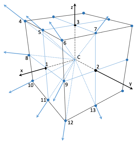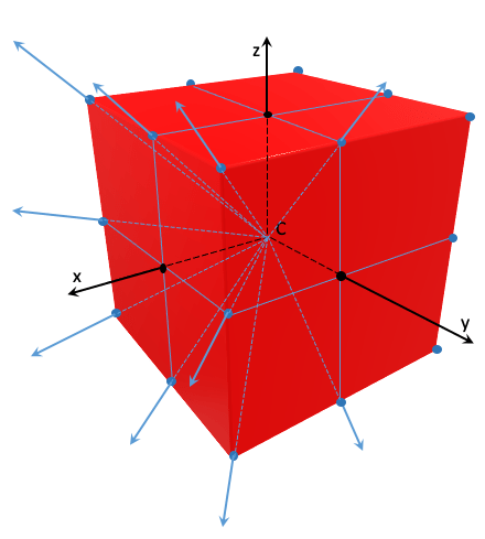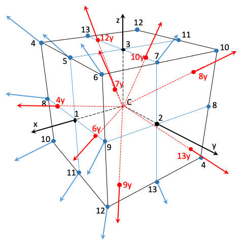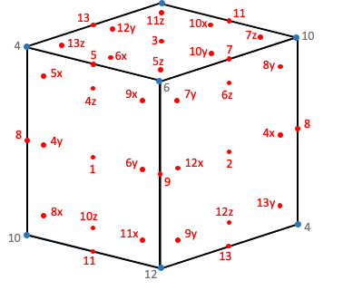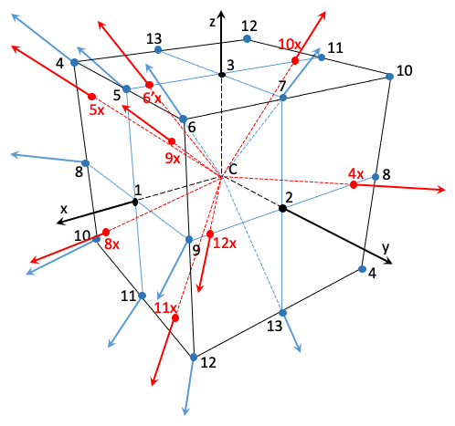De même les axes 6, 8, 9, 10, 11, 12 se retrouvent sur des directions nouvelles par rapport aux 13 directions de départ, et intersectent le cube en des nouveaux points 6x, 8x, 9x, 10x, 11x, 12x.