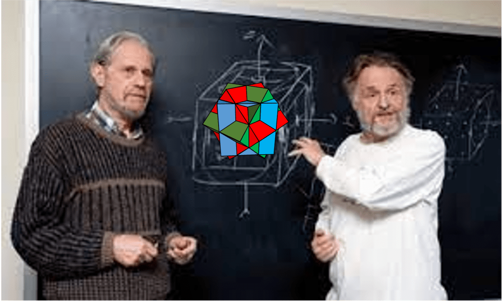 Ces 33 axes sont les axes de symétrie de la figure géométrique constituée par la superposition des cubes bleu, rouge et vert tels que présentés dans la figure 7 et qui sont chacun les images du cube initial par rotation de 45° autour de z (cube bleu), de 45° autour de x (cube rouge) et de 45° autour de y (cube vert).